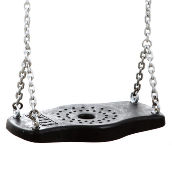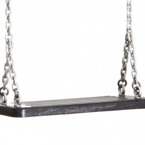 Seggiolino a tavoletta in gomma EPDM morbida con anima in alluminio e catene zincate con maglia stretta, filo mm 6 e luce interna mm 8.