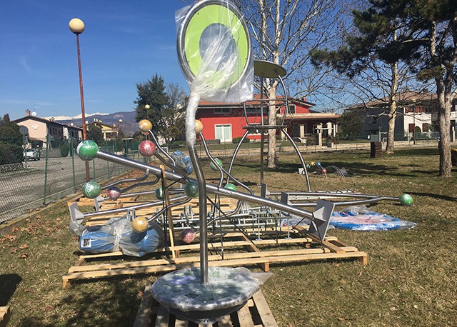 Teleferica da 20 mt, torretta Gravis 1 in acciaio inox, struttura nido, giostra girevole e giochi a molla.