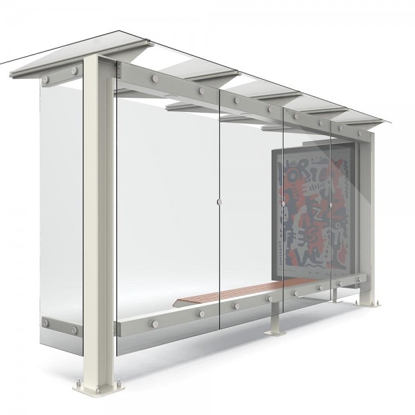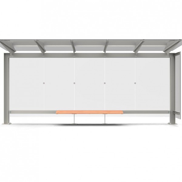 Pensilina modulare in acciaio zincato e verniciato con copertura da 149,5 cm e parete di fondo in vetro e panca in legno.