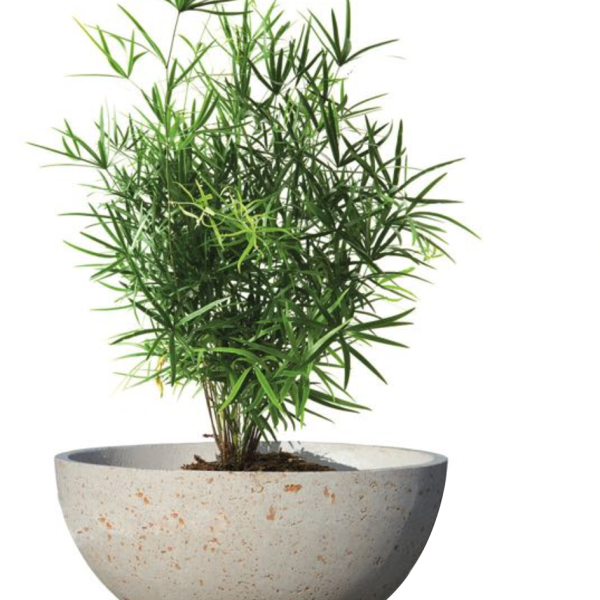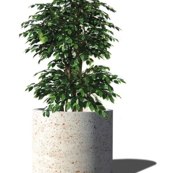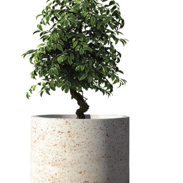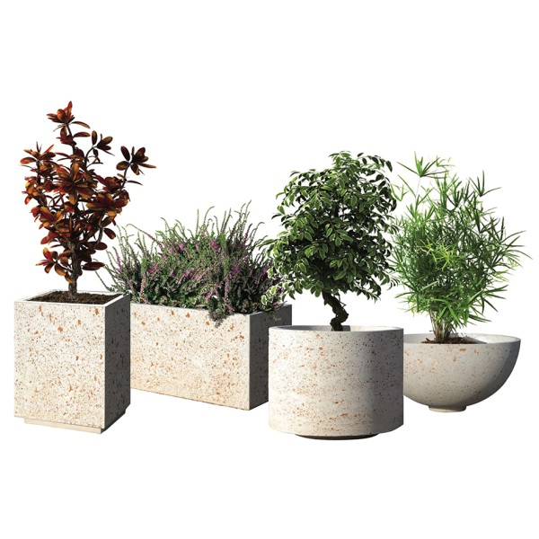 Varie tipologie di fioriere tonde, quadrate e rettangolari per arredo urbano realizzate in calcestruzzo bianco finto travertino, vibrato e levigato.