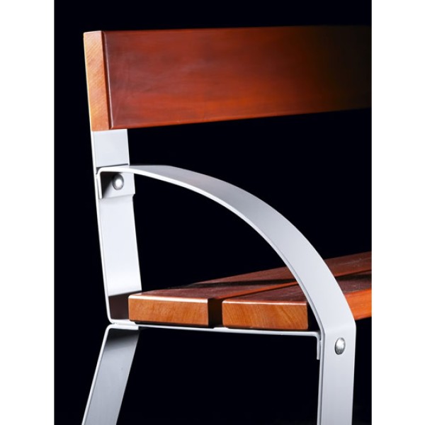 Panchina disponibile in diverse lunghezze composta da una struttura sagomata realizzata in piatto d’acciaio verniciato predisposta di bracciolo. Seduta e schienale sono realizzati in assi di legno esotico trattato con impregnante e finitura trasparente. Può essere installata sia all’interno che all’esterno.