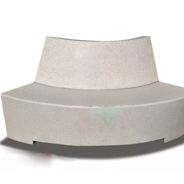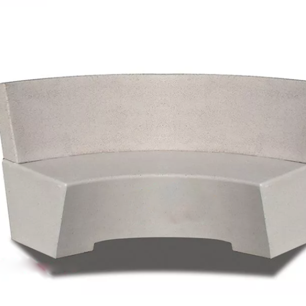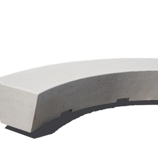 Panchina curva trapezoidale con schienale realizzata in calcestruzzo bianco, vibrato e levigato. Angoli arrotondati. Trattamento idrorepellente antidegrado lucido per esterno.