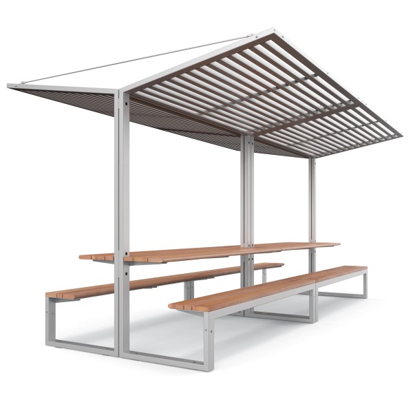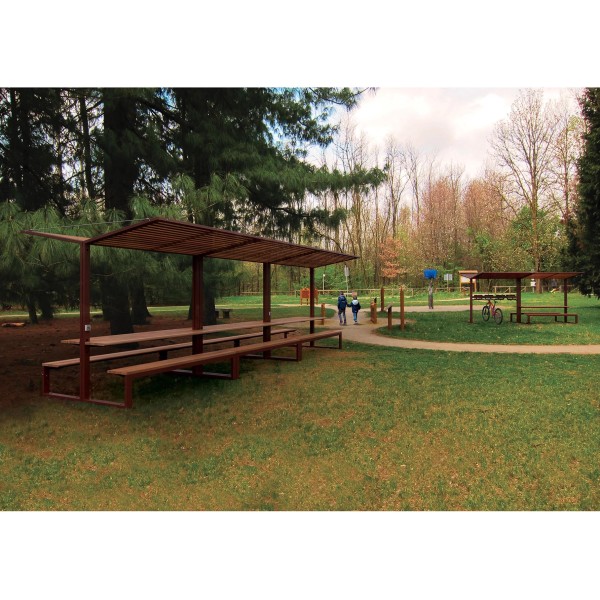 Sistema modulare multiuso, in acciaio zincato e verniciato, con tetto inclinato dotato di frangisole in legno esotico duro o in acciaio, con la possibilità di dotarlo di copertura in policarbonato alveolare.
