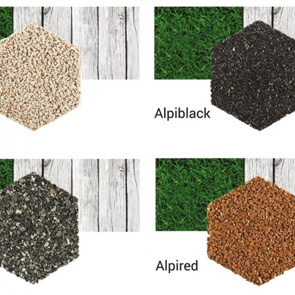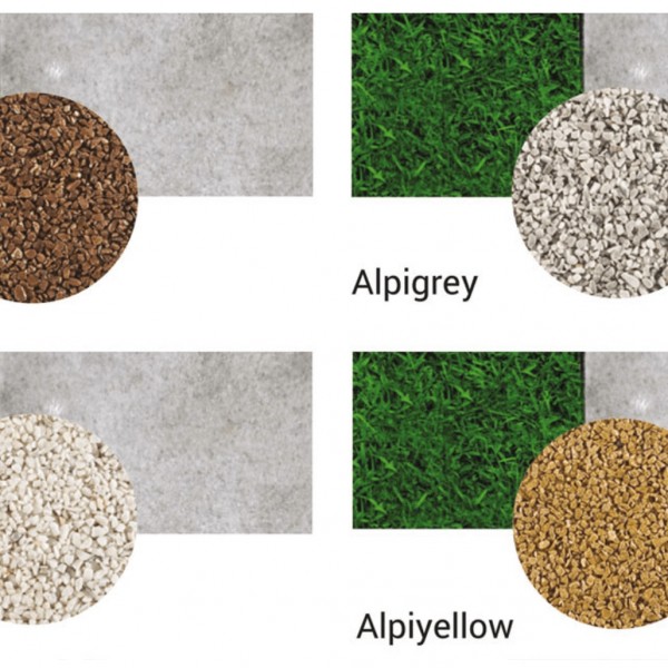 Lo strato di finitura di spessore cm 1,6 sarà eseguito con aggregato lapideo certificato CE (disponibile in otto colori a scelta), lavato ed asciugato di granulometria conforme alle prescrizioni del produttore e miscelata con un legante poliuretanico monocomponente, igroindurente, trasparente, senza solventi e resistente agli UV (non ingiallisce) non pericoloso per l’ambiente e ad alta adesività.
