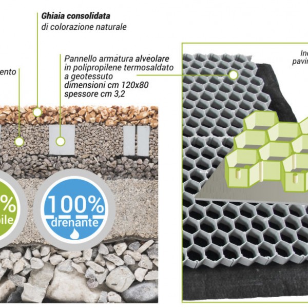 Parliamo di una pavimentazione drenate composta da un’armatura alveolare in polipropilene copolimero con 20% di carica minerale, stabilizzato agli UV per esterni, RAL 7838 (grigio chiaro), ad elevatissime caratteristiche meccanico prestazionali e riciclabile al 100%. Il pannello di armatura è saldato a caldo su un geo-tessuto agugliato di poliestere e polipropilene, densità 0,20 Kg/m², riciclabile al 100%.